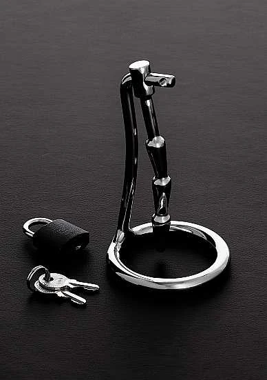 Een prachtig gebogen penisplug met drie hobbels en een cock ring gemaakt van roestvrijestaal. Je kunt hem afsluiten met het meegeleverde hangslot. Een uniek gevormde combinatie die erectie voorkomt.